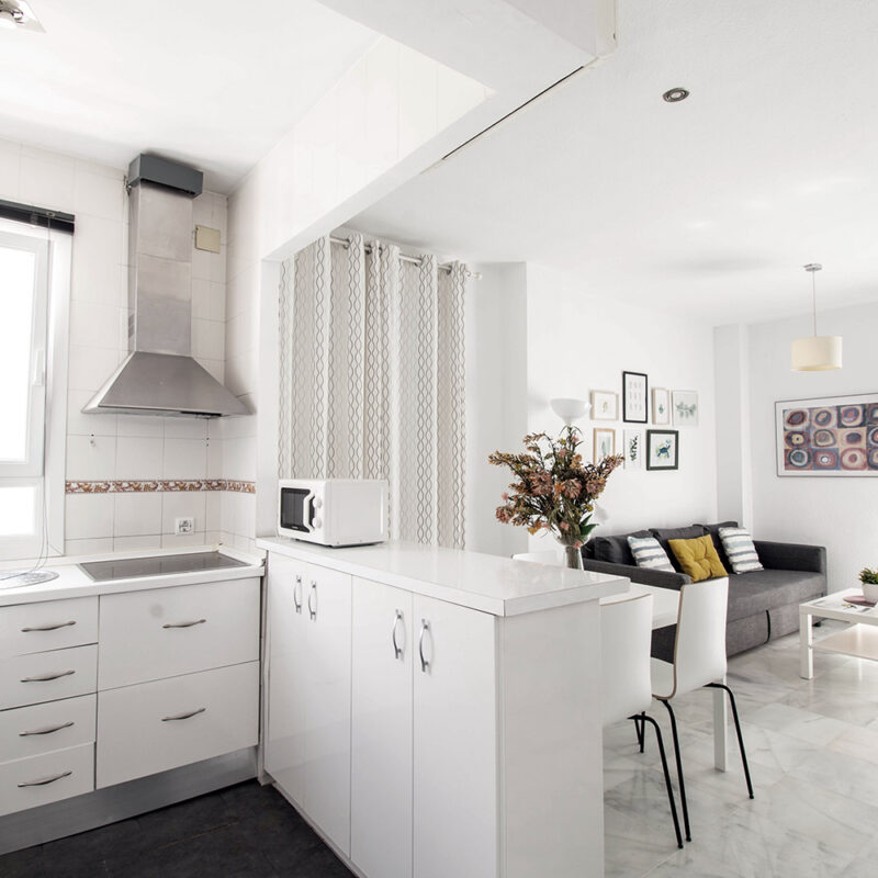 En la planta baja encontramos el salón comedor con cocina abierta e integrada, un baño con bañera y un dormitorio.